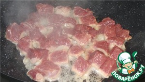 В казан или глубокую сковородку налить растительное масло, выложить небольшие кусочки мяса, немного посолить и обжаривать в течение 10 мин.