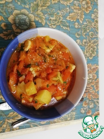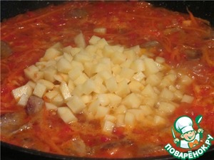 Через 30 мин. добавить нарезанный сырой картофель, тушить 15 мин. По истечении времени добавить измельченный чеснок, выключить плиту и дать настояться 5 мин.
