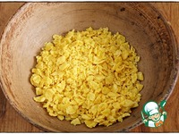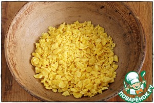 В мисочку насыпаем кукурузные хлопья без сахара, запускаем туда руку и начинаем жмакать, но без фанатизма - хлопья не должны быть мелкими, но и не целыми. Во время панирования трёх филешек, фокус со жмаканьем мне пришлось повторять три раза и хлопьев пошло примерно сто пятьдесят грамм...
