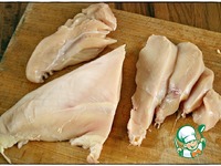 Теперь от филешки отрезаем болтающуюся малую часть, наискось нарезаем полоски толщиной примерно 1 см.