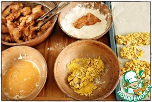 И завершающий этап... Включаем духовку, выставляем температуру на 200 градусов. Берём кухонные щипцы, поддеваем один кусочек филе, обмакиваем в муке, затем в яйце и хорошенько обваливаем в хлопьях, выкладываем на противень, застеленный пергаментной бумагой. Когда духовка прогрелась, отправляем туда противень примерно на 20-25 минут. Филе в духовке легко пересушить, по этому ориентируйтесь по своей помощнице.