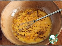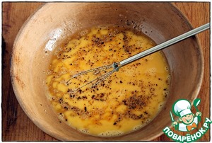 Первым делом в мисочку вобьём яйца, вилкой или венчиком хорошо размешиваем, добавляем соль, паприку (или то, что посчитаете нужным) и опять хорошо перемешиваем.