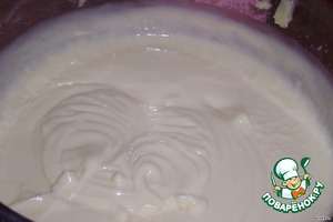 Ставим на средний огонь и мешаем до полного загустения, добавить белый шоколад, перемешать до его растворения, остудить. -
