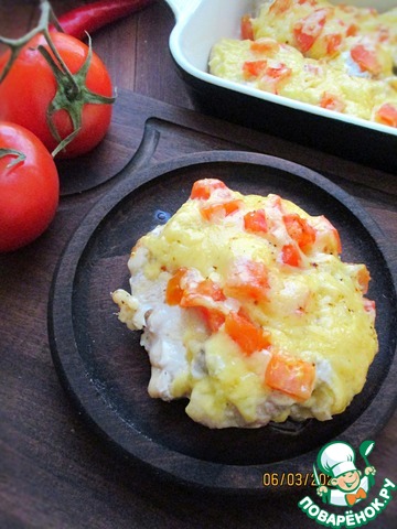 5) Берем протвинь, и в него укладываем куриное филе, далее куриное филе смазываем майонезом, посыпаем чесноком, далее посыпаем сыром и помидором, отправляем в духовку до готовности, примерно до 40 минут.