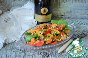 Салат перемешать, переложить на блюдо, заправить розовым перцем.