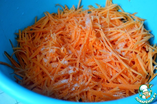 Морковь натереть на корейской тёрке или нарезать тонкой соломкой, добавить сахар ( обратите внимание на сладость моркови) и соль, слегка перетереть руками.