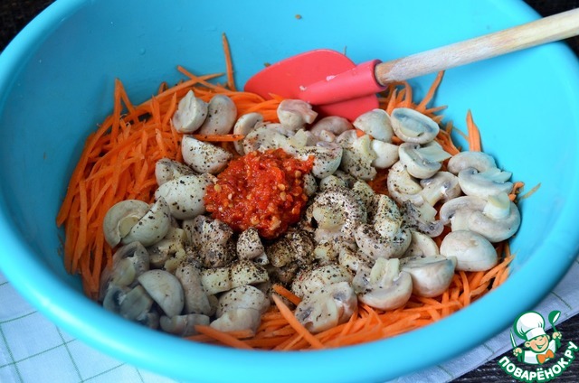 Горячим переложить в морковно-грибную смесь. Зелень нарубить, добавить. Перемешать, довести на вкус соль/сахар, перец/чеснок. Остудить.