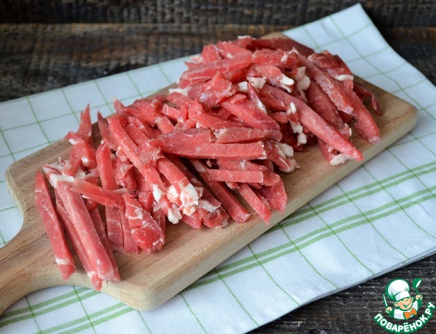 Подмороженную говядину нарезать тонкими брусками, дать оттаять.