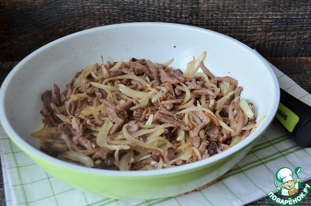 На растительном масле пожарить говядину, огонь сильный, 5 минут, помешивая.