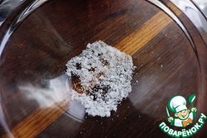 На дно посуды, где будем солить рыбу насыпаем немного соли и сахара. Соль желательно взять крупную морскую.