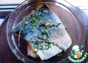 Накрываем пленкой и отправляем в холодильник на сутки. Т. к. сок от рыбы будет стекать вниз, то нужно периодически переворачивать рыбу для равномерного просаливания.