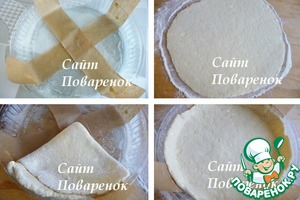 Форму для выпечки 26см смазать сливочным маслом, обсыпать манной крупой. Для удобства выемки готового пирога из формы, я выстилаю на дно полосы из пекарской бумаги. Большую часть теста раскатать в пласт, переложить в форму.