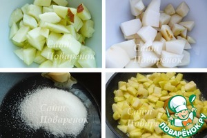 Яблоко и грушу очистить от кожицы и семян. Нарезать небольшими кусочками, сбрызнуть лимонным соком яблоко. В сковороде растопить сливочное масло, добавить сахар, перемешать. Затем выложить фрукты. Время от времени перемешивая. У меня яблоко и груша были переспевшими, тушила 2мин. Начинку остудить.