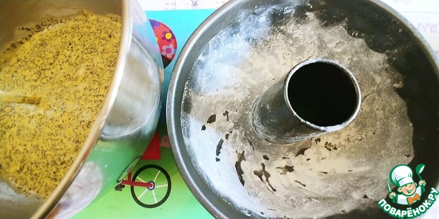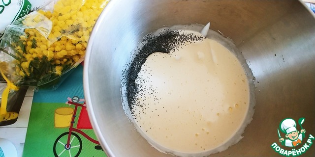 Добавляем мак, раст масло и сметану с содой, вымешиваем.