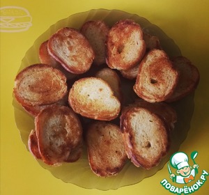 Багет порежьте и обжарьте на сливочном масле до красивой золотистой корочки. Дайте хорошо остыть.