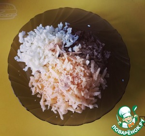 Добавьте к шпротам чеснок и натертые на крупной терке белки и сыр.