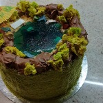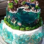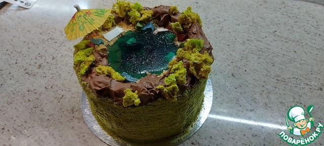 Покрыть весь торт слоем ганаша и хорошо охладить. Затем покрыть вторым слоем, нанося его максимально неровно, чтобы оставалось как можно больше рельефов. Пока крем мягкий, засыпать макушки островов зеленой кокосовой стружкой и толченым печеньем, имитируя зелень и песок. Чтобы выделить рельефы, растопить немного белого шоколада и кисточкой пройтись по поверхности торта. Установить вокруг торта кольцо от формы, прижимая к нижнему коржу. Проложить между тортом и формой ацетатную пленку или файлик. Низ кольца снаружи плотно обернуть пищевой пленкой, чтобы масимально защитить желе от вытекания. Убрать всю конструкцию в холодильник.