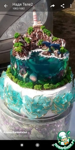 Сделать желе. Желатин залить стаканом холодной воды и дать набухнуть. В остальную воду добавить нарезанный лимон и сахар и проварить минут 5, чтобы сироп стал вкусным и ароматным. Процедить горячий сироп в миску. Добавить синий краситель и набухший желатин. От желатина сироп слегка позеленеет, добавить еще краситель, чтобы довести до цвета морской волны. Хорошо охладить.