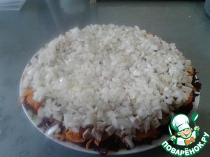 4й слой -- распределить маринованный лук, маринад слить, откинув на сито. И промакнуть на бумажном полотенце, чтобы убрать лишнюю влагу