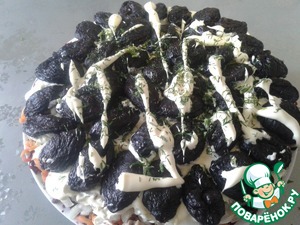 Необычный и вкусный салат. В моей семье его готовим уже много лет. На сайте такого не нашла. Названия не знаем, придумала сама. Пикантное сочетание овощей, мяса и чернослива. И легкий оттенок чесночного вкуса. Никто еще не оставался к нему равнодушен.