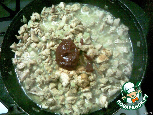 • Промариновавшуюся курицу обжариваем на растительном масле до готовности, добавляем 1 ст. л. карри, 2 ч. л. чеснока, 2 ст. л. томатной пасты, перемешиваем