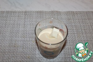 В сливки добавить сливочное масло и подогреваем в микроволновке.
