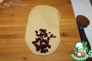 Одну половину нарезаем тонкими полосками шириной 3-4 мм. На вторую половину выкладываем клюкву.
