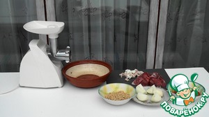 Курагу замочить в воде на 5 минут и слить. Пропустить через мясорубку мясо, жир, лук, орехи и курагу. Посолить и добавить перец.