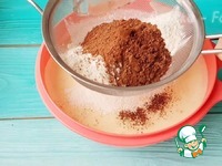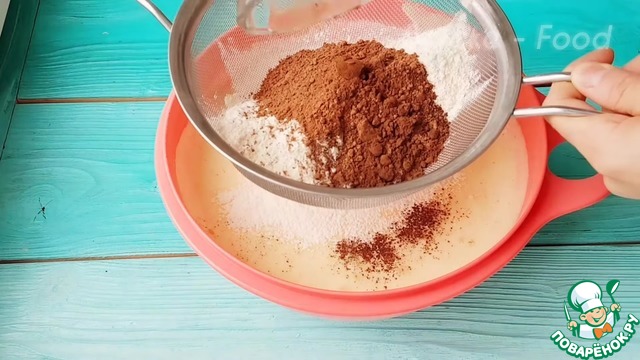 Затем добавляем муку в два этапа, разрыхлитель, какао все просеиваем и перемешиваем лопаточкой |