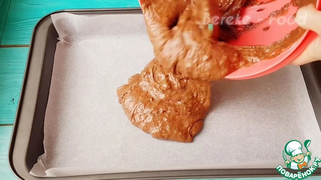 и выливаем массу в форму застеленную пергаментом и разравниваем |