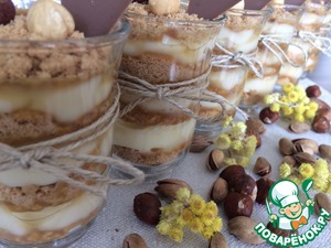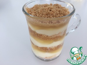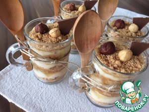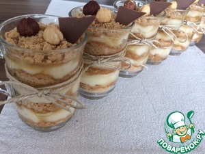 Собираем наш десерт, добавляя чайной ложкой: смесь печенья с орехами, заварной крем, бананы, карамельный соус и так до наполнения бокала.