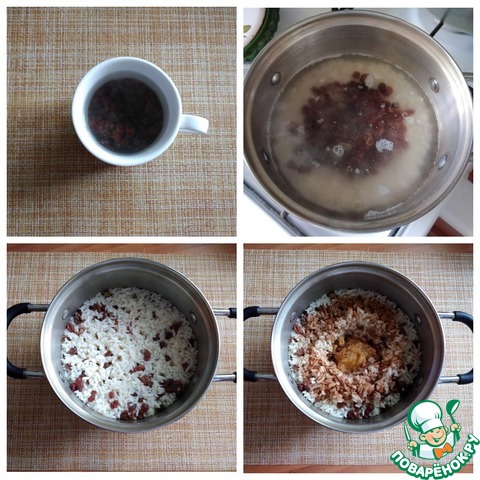 Изюм нужно залить кипятком минут на 5, откинуть на ситечко и затем хорошо промыть под проточной водой. Мы его будем варить вместе с рисом. В кастрюлю насыпаем рис, выкладываем изюм, заливаем водой, солим по вкусу и варим до впитывания всей жидкости. Это быстро, минут 15. Снимаем с огня. В центре делаем углубление и кладём туда мёд, наливаем масло подсолнечное, присыпаем по поверхности корицей. Мёд и корицу берите по вкусу. Меня количество, указанное в ингредиентах, устраивает. Масло подсолнечное в постные дни во время Поста класть не обязательно, а в обычные дни вне Поста его хорошо заменить сливочным маслом. Я налила нерафинированного подсолнечного масла. Говорю сразу, что ярко выраженного запаха его нет в готовом блюде.