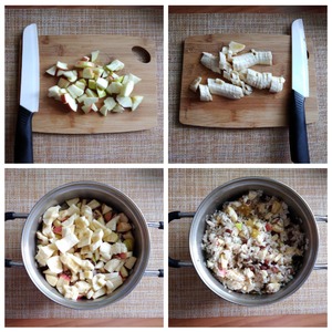 Яблоко и банан мелко режем. Лучше это делать керамическим ножом, от него эти фрукты долго не окисляются (не темнеют). Выкладываем фрукты поверх каши и всё тщательно перемешиваем. Кашу нужно поставить минут на 30 в тепло. Я грею немного духовку до т-50-75 С примерно. Можно просто укутать тёплой тканью какой-то. Это нужно для того, чтобы все вкусы объединились, и каша забрала остаточки влаги. Она будет ещё ароматней и рассыпчатей.