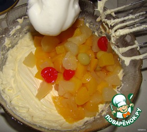 Желтки перетираем с сарором до бела... смешиваем с сыром.. и фруктами.. в последнюю очередь добавляем взбитые в крепкую пену белки..