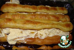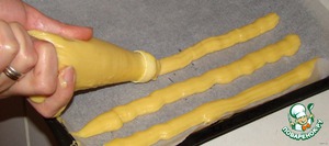 С помощью кондитерского мешочка отсаживаем палочки на противень и ставим в духовку на 20 минут... выпекаем при температуре 220