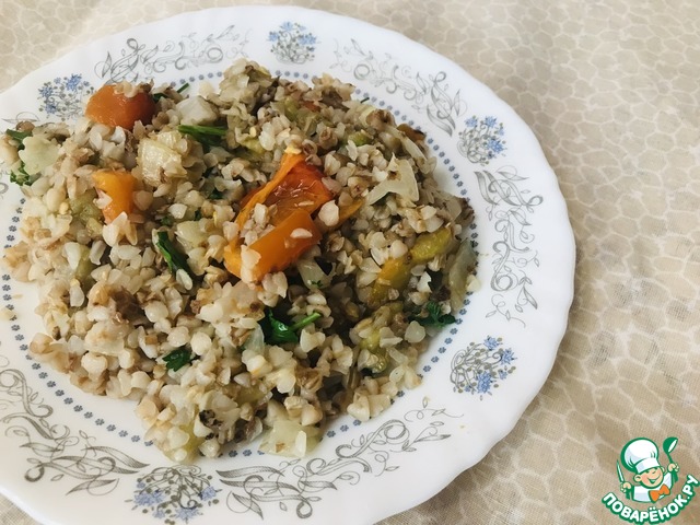 Добавить к гречке, аккуратно перемешать. Добавить рубленую зелень, оставшееся растительное масло. Подержать пару минут на огне.