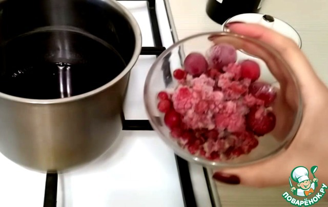 Высыпаем всевозможные ягоды, которые у вас есть - малина, клубника, вишни, смородина, ежевика и прочее. Можно использовать, как свежие, так и замороженные ягоды. У меня - замороженные.