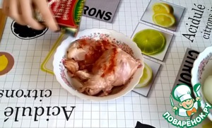 Нам понадобятся любые части курицы. Их нужно посолить, натереть красным острым перцем.