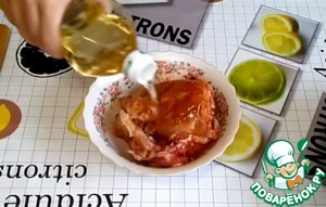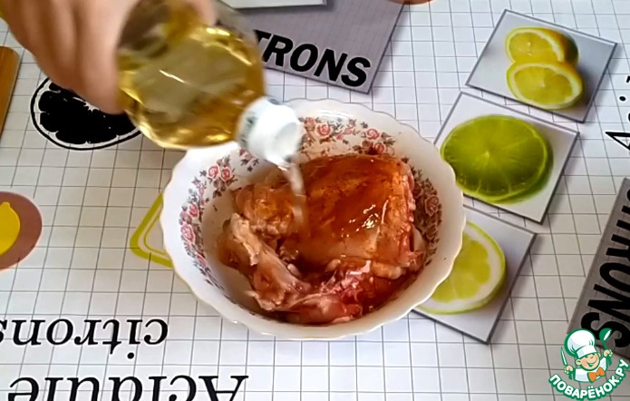 Добавляем немного растительного масла. Хорошо натираем куриные части. -