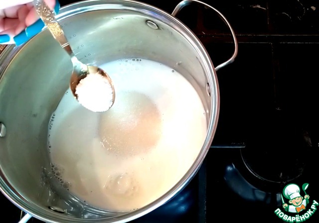 Выливаем в кастрюлю молоко, растительное масло. Высыпаем сахар.