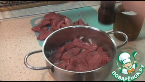 Сверху выкладываем слой мяса. Посолим, поперчим, выкладываем следующий слой мяса, солим, перчим и так делаем, пока не закончится мясо.