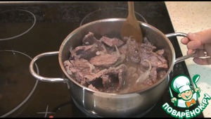 Через час хорошо перемешаем мясо и лук, накроем крышкой и тушим ещё час или если нужно больше, чтобы мясо стало мягким и нежным.