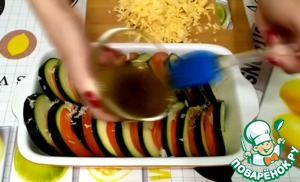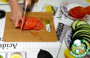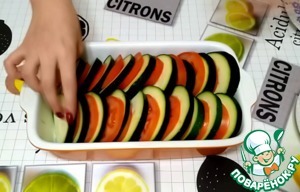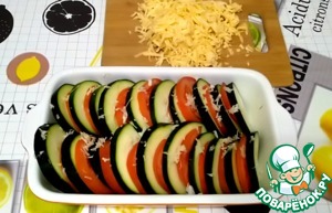 В форму для запекания выкладываем поочередно кабачки и помидоры.