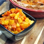 3. Картофель, лук и морковь заливаем томатной смесью и добавляем масло, все хорошо перемешиваем и перекладываем в рукав. Плотно завязываем рукав, перекладываем его на противень и делаем сверху рукава проколы зубочисткой.