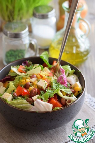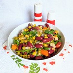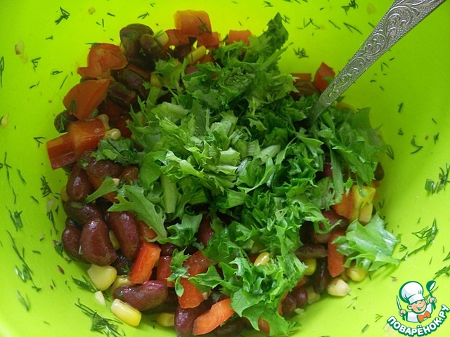 С кукурузы и фасоли слить жидкость, фасоль промыть, дать воде хорошо стечь. -