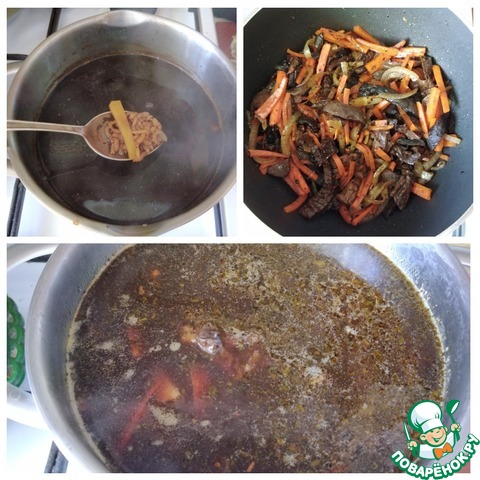 Сухие грибы нужно замочить на ночь в холодной отфильтрованной воде. На утро слить воду через мелкое сито или слои марли в кастрюлю, где будем варить бульон, на дне оставляя весь осадок. Это конечно в том случае, если это ваши грибы и вы в них уверены, что они чистые и без песка. Режем грибы помельче и отправляем в кастрюлю со слитой жидкостью вариться. Солим по вкусу. Варим грибы до готовности. У меня ушёл примерно час. -