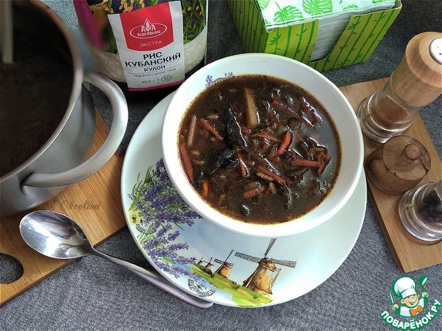 Пряный грибной суп из сушёных лесных грибов с рисом, базиликом с добавлением оливкового масла.