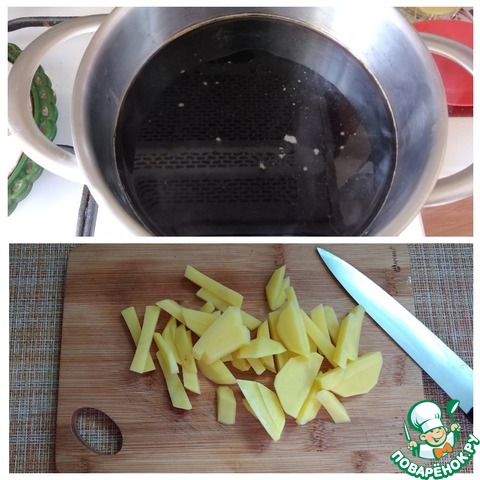 Грибной бульон из сухих лесных грибов очень насыщенный и для супа я его разбавлю водой: один к одному. Берём кастрюлю, где будет вариться суп. Наливаем в неё 0,5 л бульона грибного и 0,5 л воды, ставим на огонь. Когда в кастрюле закипит, выкладываем рис. Доводим до кипения, убавляем огонь и варим рис 5 минут. Картофель нарезаем произвольно. Отправляем к рису и варим всё до готовности.
