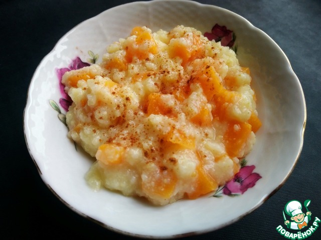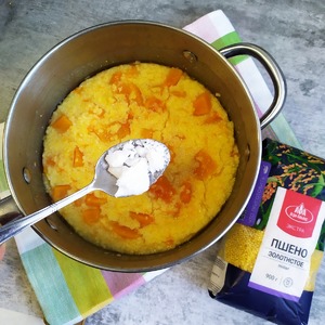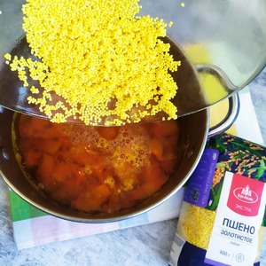 Положить в кастрюлю и варить 10 минут. Далее с пшена слить воду. Добавить пшено в кастрюлю с тыквой и, постоянно помешивая, варить 20 минут на среднем огне.