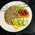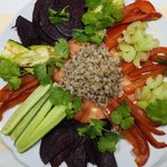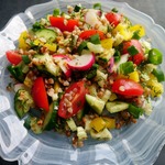 Салат из микса овощей с отварной гречкой, заправленный пикантной заправкой.